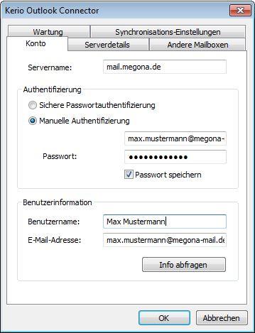 Testen Sie die Einstellungen mit Klick auf Info Abfragen. Hier sollten nun Ihr Megona CONNECT Benutzername und E-Mail-Adresse automatisch eingetragen worden sein. Klicken Sie auf OK.