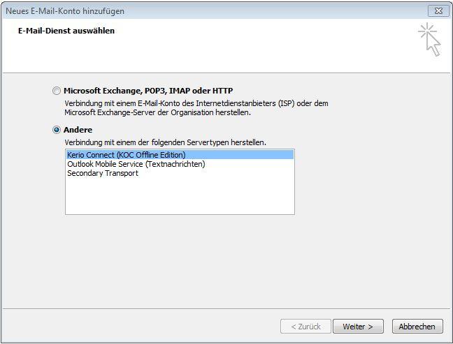 Wählen Sie Andere --> Kerio Connect (KOC Offline Edition) und klicken Sie auf weiter.