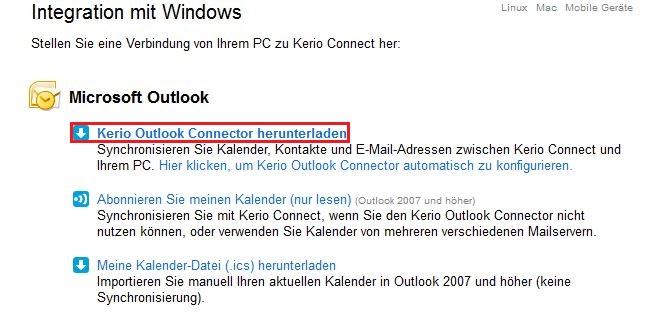 Klicken Sie auf Kerio Outlook Connector herunterladen. (rot markiert).