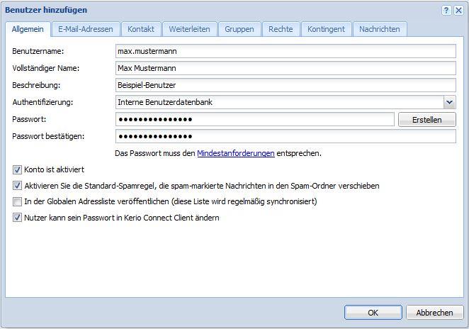 Setzen Sie weitere Einstellungen in den Reitern Email Adressen, Kontakt, Weiterleitungen, Gruppen, Rechte, Kontingent, Nachrichten und klicken Sie auf OK.